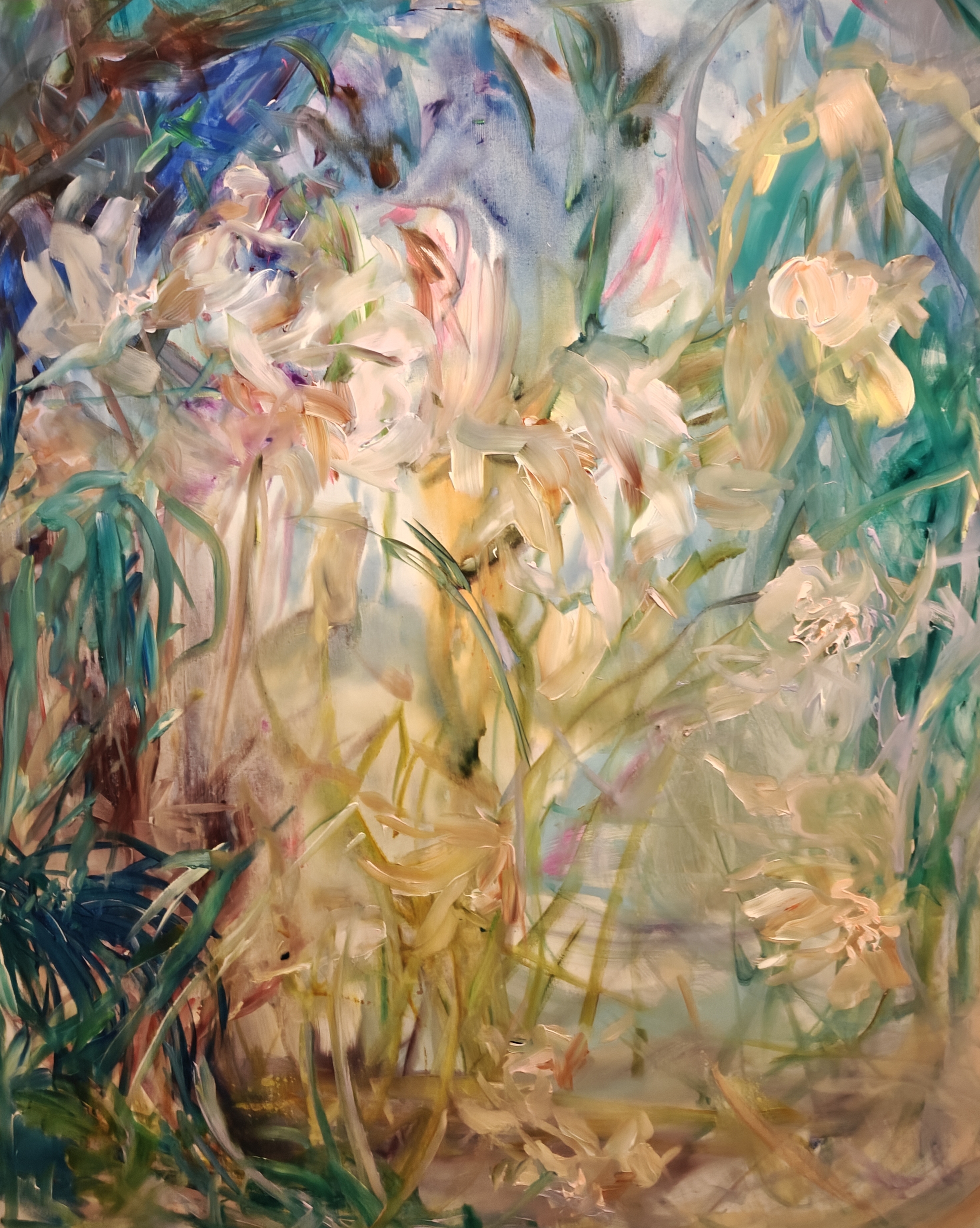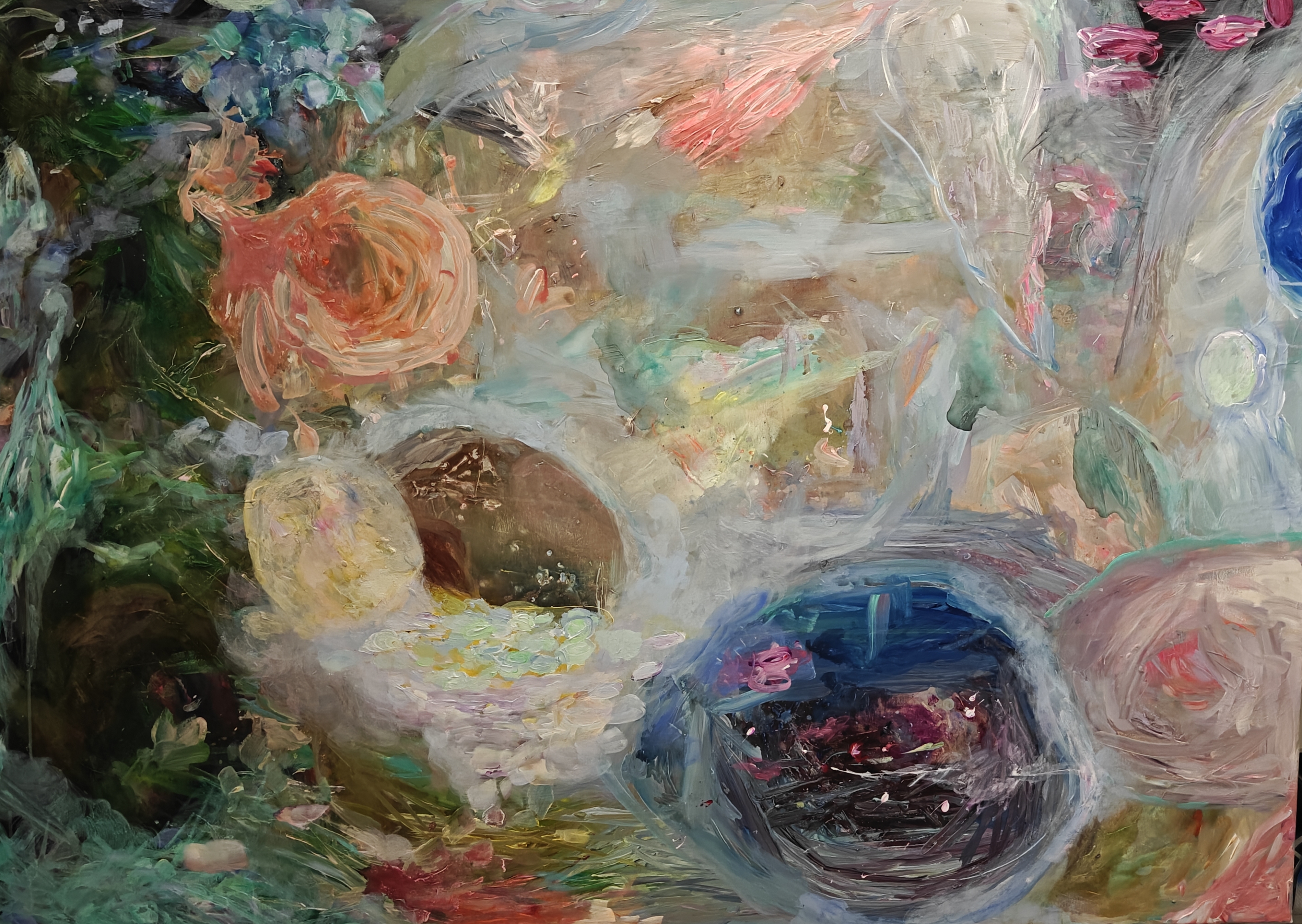 In my art, I find inspiration, especially in the aesthetic of past decades, focusing on the manor and garden milieus, as well as the spaces individuals create for themselves for everyday escapes. I aim to create connections between the past and present, as well as between dreams and reality. Alongside nature, women and the diverse roles of women play a central part in my art. In 2025, I have focused more on, for instance, abstraction, bodies, humour, and drawing inspiration from the color palette of the Baroque.